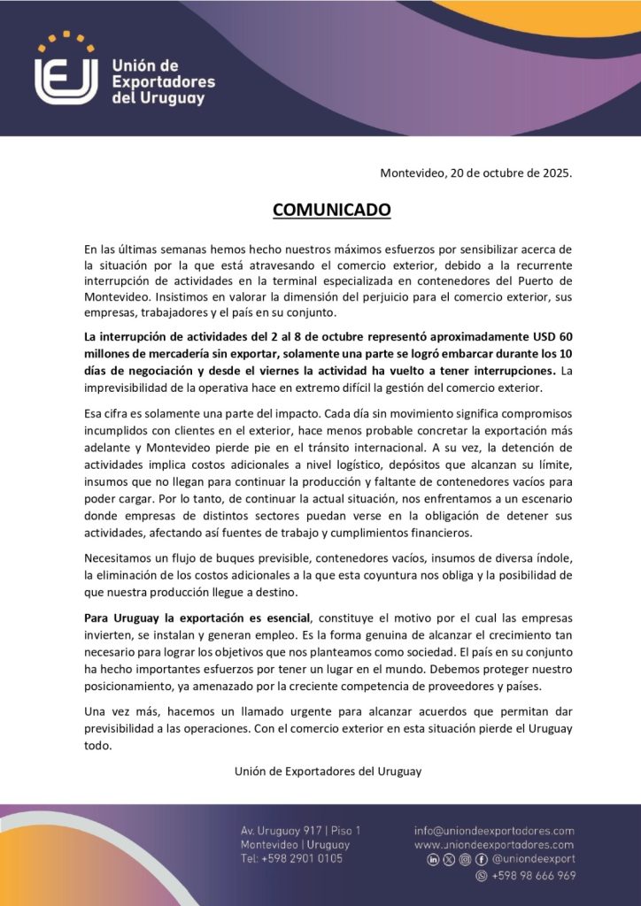 “La interrupción de actividades del 2 al 8 de octubre representó aproximadamente USD 60 millones de mercadería sin exportar”, expresó la Unión de Exportadores del Uruguay (UEU) a través de un comunicado, este lunes 20.