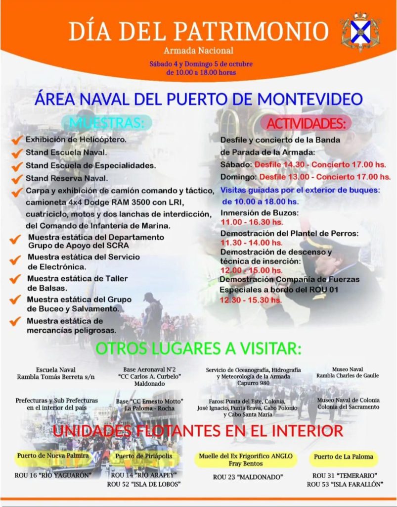 La Armada Nacional es otra de las instituciones que integra el programa del Día del Patrimonio, con una nutrida agenda de actividades, que incluirá exhibiciones, muestras, demostraciones y visitas guiadas en el área naval del Puerto de Montevideo, de 10:00 a 18:00 horas.