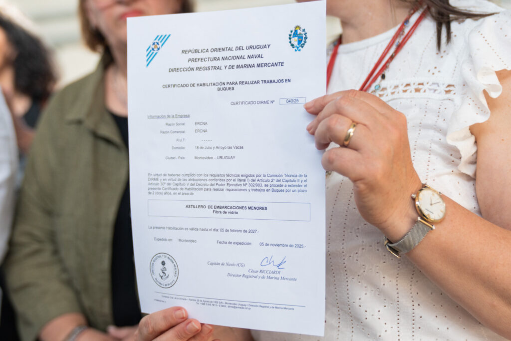 La Escuela Técnica de Reparaciones, Construcciones Navales y Anexos (Ercna) recibió el viernes 5 en sus instalaciones en Carmelo, Colonia, el certificado por parte de la Dirección Registral y de Marina Mercante de la Prefectura Nacional Naval, que la habilita como astillero naval.
