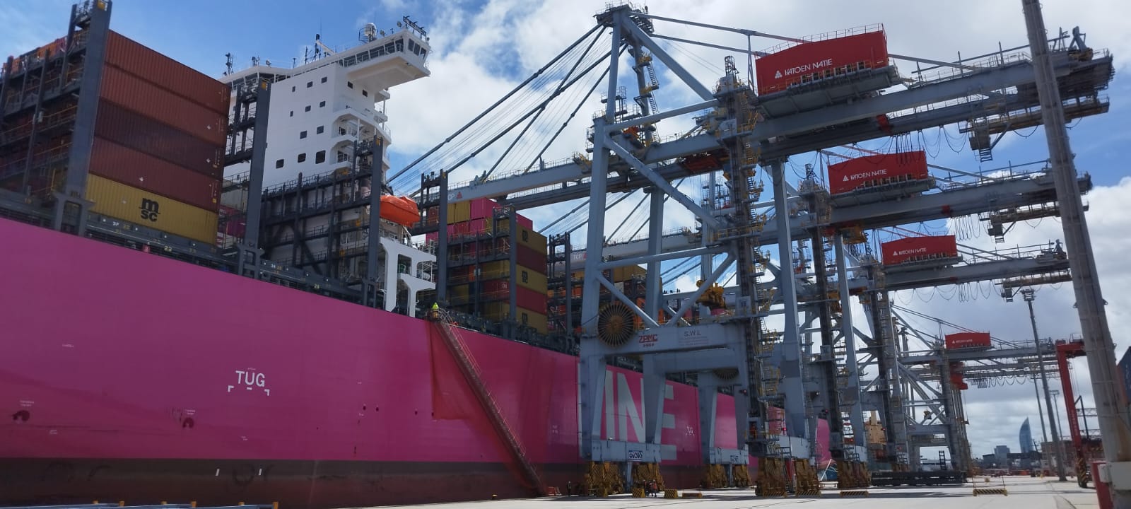 El buque Neo-Panamax, de la naviera japonesa Ocean Network Express (ONE) es, hasta la fecha, el más grande que recaló en el enclave rioplatense. Aquí realiza, en 15 horas de operativa, unos 1.000 movimientos de carga y descarga de contenedores antes de continuar su ruta a Buenos Aires.